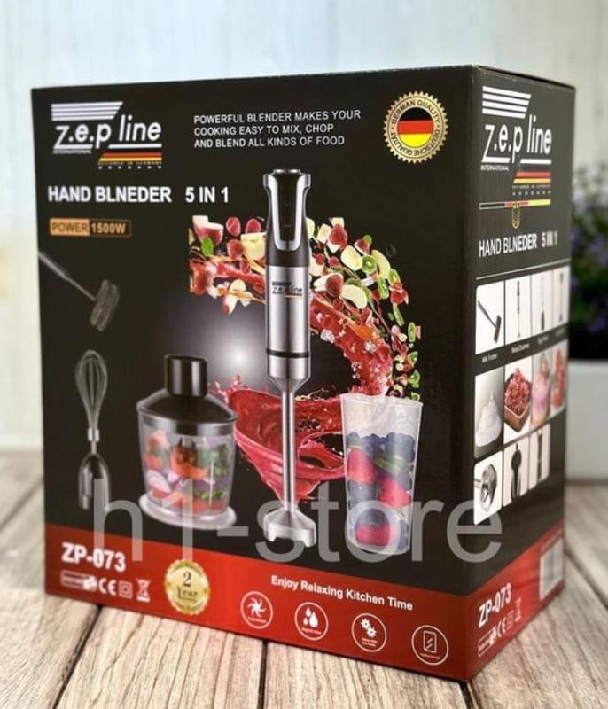 Занурювальний блендер 5 в 1 з ножем з нержавіючої сталі та безліччю режимів швидкості Zepline, Блендер для смузі, крем-супів, пюре з регулятором швидкості Характеристики: - Кількість швидкостей: 20+ турбо - Матеріал: Нержавіюча сталь - Тип блендера: занурювально-універсальний - Потужність: 1 500 BT - Колір чорний - Комплект: чаша, 4 насадки Переваги: - Модель має різні насадки, що допомагають готувати різноманітні страви з легкістю; - Є 20 швидкостей + турбо та дозволяє підібрати оптимальний режим для подрібнення різних типів продуктів; - У ньому добре готувати коктейлі, смузі, дитяче харчування, а також колоти лід, збивати білки з цукром і навіть робити фарш; - Блендер може використовуватися як звичайний занурювальний, а також може працювати як стаціонарний подрібнювач; - Ніжка з нержавіючої сталі із захистом від розбризкування.