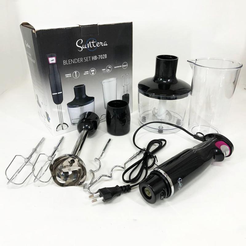 Блендер Suntera HB-702B, 800Вт ПЕРЕВАГИ: Ніжка з нержавіючої сталі Поштужний – 800Вт Турбо режим Багатофункціональний: 4 в 1 ХАРАКТЕРИСТИКИ: Матеріал корпусу: пластик Матеріал ніжки блендеру: нержавіюча сталь Колір: чорний Режимів швидкості: 1 (+ турборежим) КОМПЛЕКТАЦІЯ: Мірний стакан 600мл Міні подрібнювач Подвійний вінчик Насадка до тіста