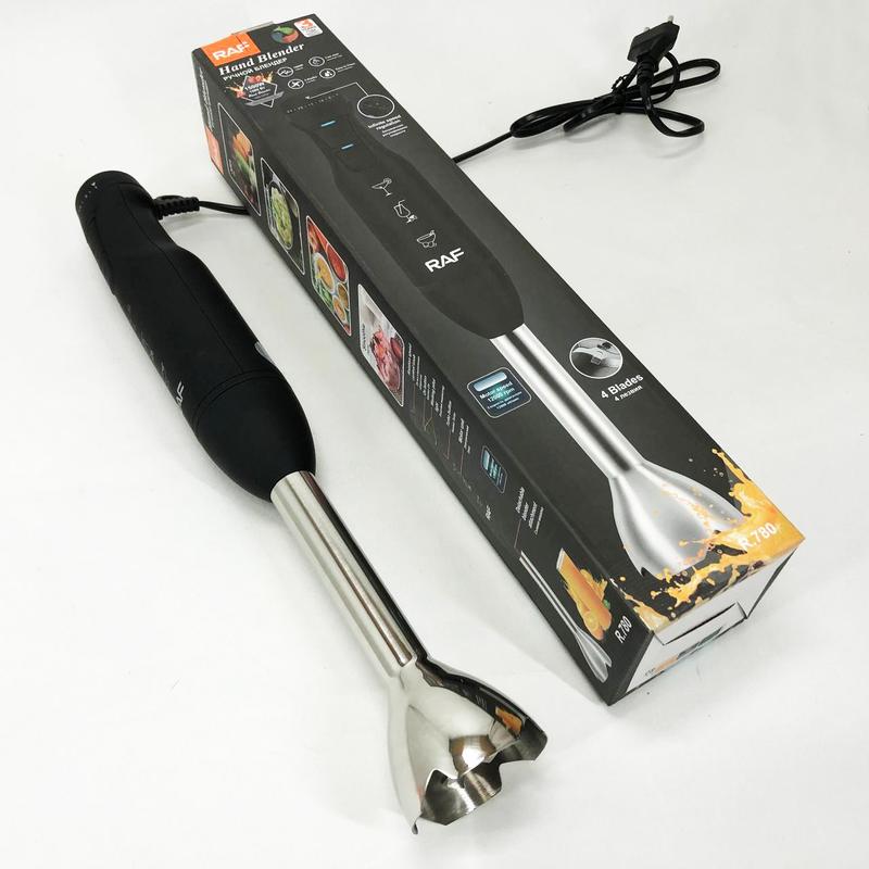 Погружной блендер R780 -- это незаменимый кухонный прибор, который позволяет быстро и эффективно измельчать различные продукты. Мощный мотор легко справляется с приготовлением смузи, соусов, крем-супов и детского питания, обеспечивая однородную консистенцию. Лезвия из нержавеющей стали гарантируют равномерное смешивание ингредиентов. Блендер удобно лежит в руке благодаря эргономичной конструкции, что делает процесс использования комфортным даже при длительной работе. Простая система управления позволяет легко управлять устройством, легко чистится. Компактные размеры облегчают хранение, а регулировка скорости обеспечивает оптимальную мощность для разных потребностей. - Мощность: 1500 Вт. - Регулировка скорости: да. - Функция колки льда: да. - Скорость мотора: 12000 об/мин. - Режим "Турбо": да. - Количество лезвий: 4. - Материал корпуса: пластик. - Материал погружной части: нержавеющая сталь . - Напряжение питания: 220-240В, 50/60 Гц. - Длина сетевого шнура: 1,2 м.