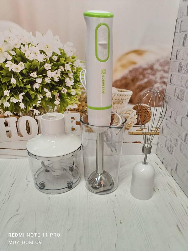 Погружающий блендер измельчитель миксер 800 Вт. Набор 4В 1 Edenberg EB-60031 Мощность и удобство 800 Вт. Мощный, но тихий. Мотор мощностью 800 Вт быстро смешает и измельчит. Защита от брызг и нескользящая ручка Погружающий блендер измельчитель миксер 800 Вт. Набор 4В 1 Edenberg EB-60031 Мощность и удобство 800 Вт. Мощный, но тихий. Мотор мощностью 800 Вт быстро смешает и измельчит. Насадка измельчитель Измельчите пряные травы, чеснок, орехи, сыр пармезан с помощью насадки-измельчителя: отличный соус "Песто" легко и быстро. Насадка-венчик Сбитые сливки для торта, безе из яичных белков, омлет и легкое тесто для тонких блинчиков поможет приготовить насадку-венчик. Погружающий Блендер Набор 4В 1 4 В 1 Функции: Измельчение, Смешивание, Сбивание, Дробление Материал Корпуса: Пластик Материал Вала: Нержавеющая Сталь Материал Лезвия: Нержавеющая Сталь. 2 Скорости Защита от разбрызгивания Петля для подвешивания. Нижняя часть Блендера легко снимается и ее удобно мыть. Мощность: 800 Вт. Электропитание: 220-240 В, 50-60 Гц.