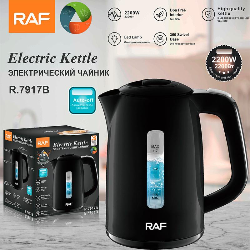 ОСНОВНА ХАРАКТЕРИСТИКА: Переваги: Швидкий нагрів: потужність 2200 Вт забезпечує швидке кип'ятіння води. Велика ємність: об'єм 1,7 літра підходить для всієї родини. Безпека: автоматичне вимкнення запобігає перегріванню і спрацьовує за відсутності води. Зручність використання: основа, що обертається на 360°, спрощує встановлення чайника на підставку. Екологічність: матеріали без вмісту бісфенолу А для вашого здоров'я. Елегантний дизайн: стильний корпус з LED-підсвіткою додає сучасності вашій кухні. Характеристики: Фірмове найменування: RAF; Модель: R.7917; Колір: чорний; Потужність: 2200 Вт; Напруга: 220-240 В; Ємність: 1,7 л; Матеріали: пластик і нержавіюча сталь; Розміри: 22х19 см; Функції: автоматичне вимкнення, основа, що обертається, на 360°; Джерело живлення: електричне.