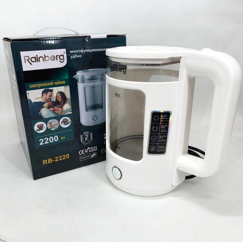 Электрочайник rainberg rb-2220 стеклянный, дисковый прозрачный. чайник с подсветкой 2200 в...