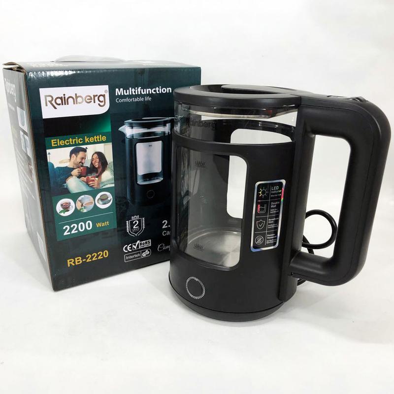Електрочайник rainberg rb-2220 скляний дисковий прозорий. чайник із підсвічуванням 2200w....