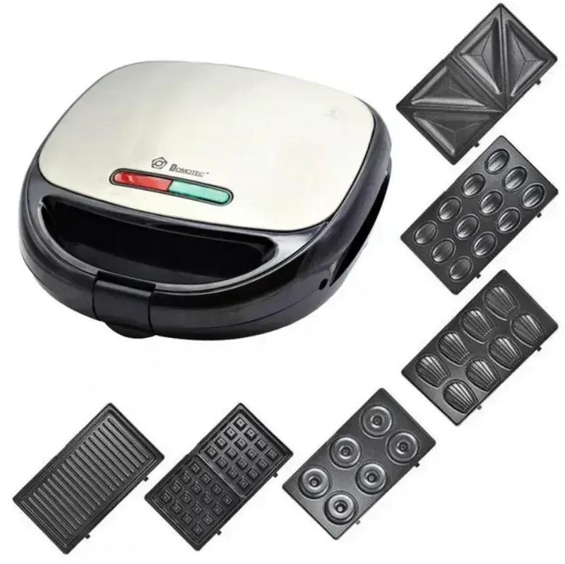 Бутербродница мультимейкер гриль 6 в 1 Domotec MS 7706 1000 вт Мультимейкер 6в1 со съемными формами MS 7706 - это отличный способ сэкономить время и за считанные минуты приготовить горячие бутерброды с самыми разными начинками, пышные вафли, хлебцы, кексы, печенье «орешки», пирожки и пончики. Бутербродница MS 7706 имеет 6 видов насадок. Гриль контактный (прижимной) Орешник (печенье «орешки») Бутербродница (сэндвичница, тостер треугольнички) Вафельница (толстые бельгийские вафли, они же венские, брюссельские, гофре) Пончики (пончики, сушки) Мадлен (мадлен, ракушка) Достоинства: Антипригарное покрытие Легко использовать и чистить Нескользящие ножки Индикатор нагрева Индикатор работы Не нагревающаяся ручка Съемные панели. Характеристики: Тип: мультипекарь/сэндвичница Материал корпуса: Металл, пластик Материал пластин: Металл Мощность: 1000 Вт. Сеть 220-240 В Количество отделений: 2. Количество пластин: 6 Размеры пластин: 22 х 12 Комплектация: Мультимейкер 6в1 MS-7706 Сменные пластины - 6 шт. Инструкция Упаковка
