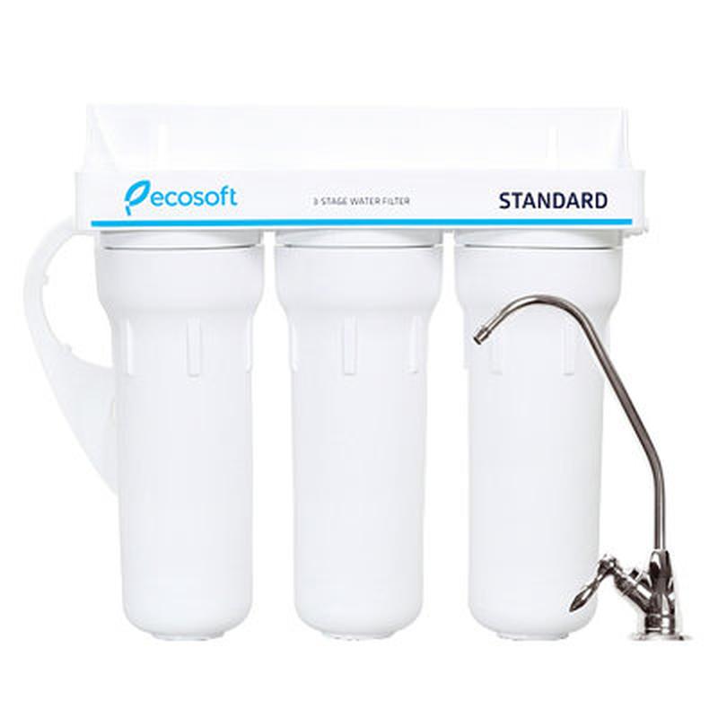 Потрійний фільтр Ecosoft Standard (FMV3ECOSTD) призначений для очищення проточної води. Триступенева система фільтрації ефективно і ретельно очищає питну воду, пом'якшує її, видаляючи хлор та інші шкідливі для здоров'я людини домішки і речовини. Фільтр складається з трьох колб, до кожної з яких передбачений окремий змінний поліпропіленовий картридж. Встановлюється фільтр під мийкою, має компактні габаритні розміри 420×370×150 мм. Продуктивність 1л води в хвилину. Фільтр Ecosoft Standard поєднує в собі високу якість і низьку вартість очиищення води. З появою триступеневої системи очищення у Вашому домі - життя зміниться: приготовані страви стануть смачніше і корисніше, напої знайдуть більш природний смак, а побутові прилади, з використанням води, стануть захищені від накипу