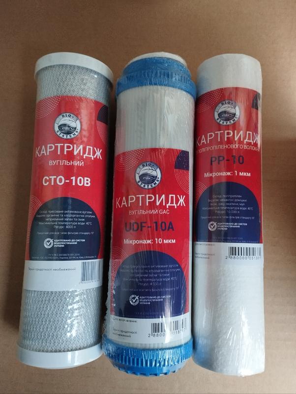 Комплект картриджів для зворотного осмосу: Поліпропіленове волокно 1 мікрон; Гранульоване вугілля; Пресоване вугілля.