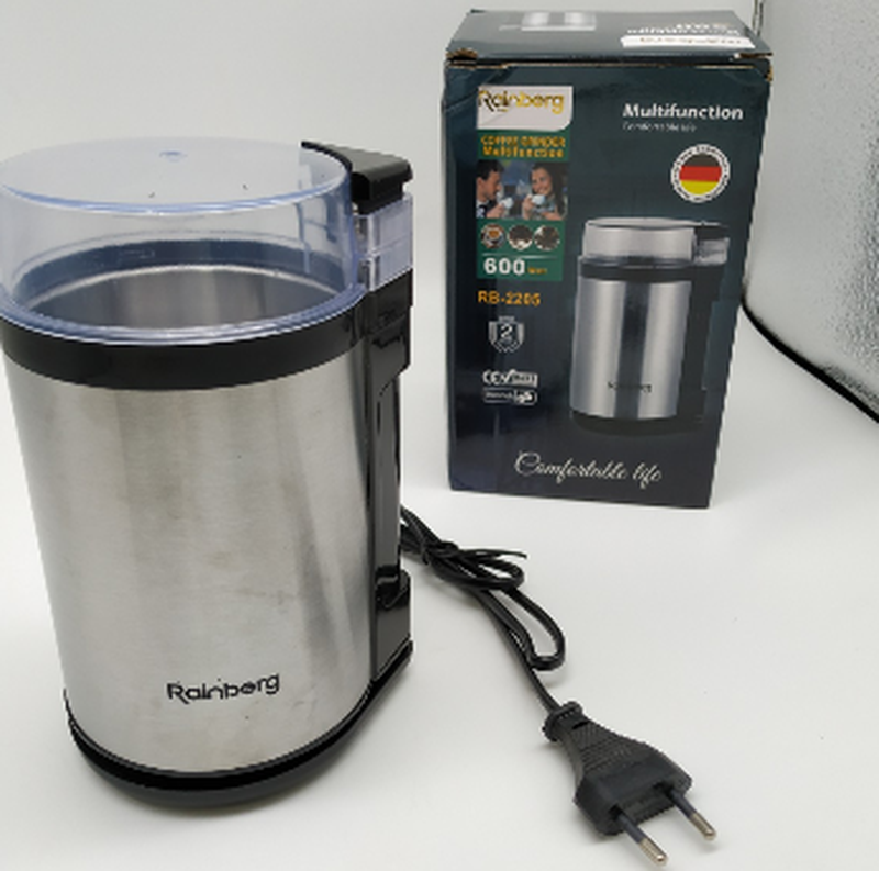 Компактная электрическая кофемолка RB-2205 , не займет много места на кухне и прекрасно подойдет к любому интерьеру. Острый стальной нож справится с измельчением кофейных зерен в считанные минуты и позволит приготовить вкусный и бодрящий напиток сразу на двоих человек. Отличный вариант для всех кофеманов и просто любителей этого популярного напитка. Прибор оснащен прозрачной крышкой, позволяющей полностью контролировать процесс приготовления. Работает от электросети 220 вольт. Электрокофемолка Rainberg RB-2205 мощная 600 W измельчает кофейные зерна, орехи, семена, а также крупы в муку, сахарный песок в пудру. Любите свежемолотый кофе по утрам? Или нужно измельчить орехи для вкусной выпечки? Кофемолка мощностью 600 Вт быстро и легко измельчит ваши любимые кофейные зерна, орехи или семена.