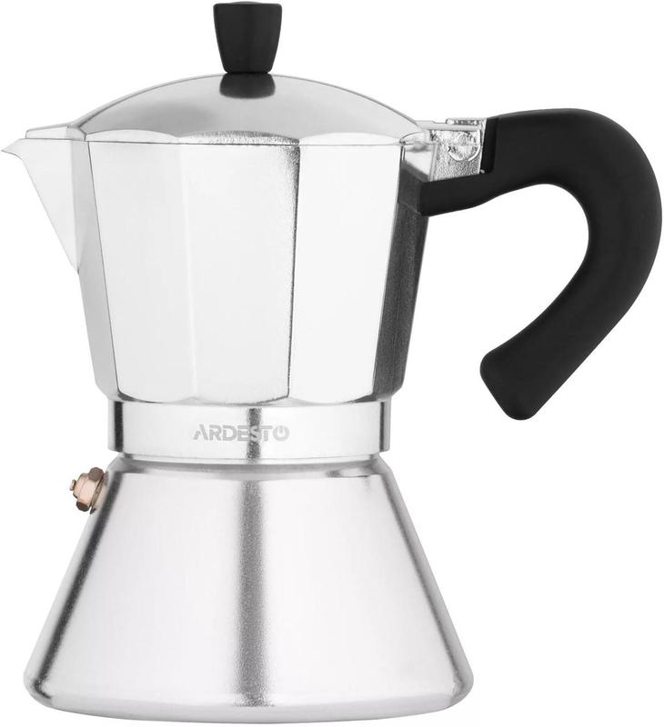 Швидко і за мінімальних зусиль отримати заряд бадьорості допоможе гейзерна кавоварка ARDESTO. Принцип роботи надзвичайно простий: гаряча вода, що витісняється під тиском пари, піднімається з нижнього резервуара у верхній через відділення з меленою кавою. Характеристики: Матеріал: алюміній. Матеріал ручок: нейлон. Об'єм, мл: 300. Кількість приготованих чашок: 6. Сумісність з плитами: Газові, електричні, склокерамічні, галогенні, індукційні. Очищення в посудомийній машині: ні.