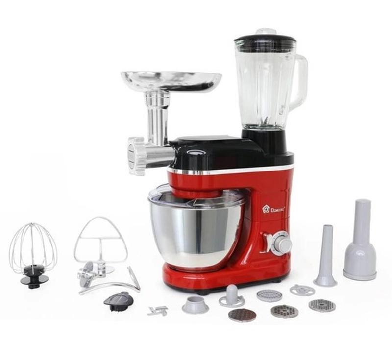 ОСНОВНА ХАРАКТЕРИСТИКА: Тип управління: Механічне; Колір корпусу: Червоний; Кількість швидкостей: 3; Матеріал корпусу: Пластик; Об'єм чаші: 4 л; Матеріал чаші: Нержавіюча сталь; Призначення: Побутове; Потужність: 3500 Вт; Тип приладу: Кухонний комбайн; Режим пульсації; Присоски на основі запобігають ковзанню комбайна; Вага: 10 кг. КОМПЛЕКТАЦІЯ: Кухонний комбайн; Насадка гак для замісу; Насадка вінчик; Блендер; М'ясорубка; 3 х диски (3 мм. 5 мм. 7 мм); Чаша з нержавіючої сталі з кришкою; Ємність для змішування зі знімною кришкою; Інструкція; Паковання.