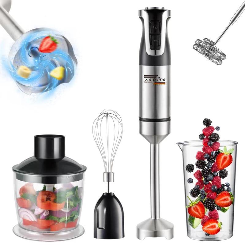 Опис Zepline ZP-073 — зручний і практичний занурювальний блендер із продуманою конструкцією й набором аксесуарів, що істотно розширюють його можливості. Ця модель призначена для якісного та швидкого подрібнення, змішування різних продуктів, збивання рідких інгредієнтів, а також спінювання молока. ОСОБЛИВОСТІ КОНСТРУКЦІЇ Регулювання швидкості згідно з поставленим завданням ви можете вибрати відповідну швидкість роботи блендера — низьку або турбо. Остання призначена для подрібнення жорстких продуктів. Ножі металеві ніжки блендера та мініподрібнювача виготовлені з високоякісної неіржавкої сталі. Це дає змогу ефективно обробляти навіть жорсткі продукти. Мініподрібнювач Комплект мініподрібнювача складається з чаші об'ємом 600 мл, насадки з ножем і кришки. Він призначений для швидкого розмелювання різних продуктів: від овочів і фруктів до м'яса та горіхів. Мірний стакан Пластиковий мірний стакан не містить бісфенолу А, а отже, безпечний для здоров'я. Це ще одна ємність для оброблення продуктів за допомогою ніжки блендера, віночка або спінювача молока. Віночок Ви можете використовувати цей прилад як ручний міксер завдяки наявності вінчика та відповідного перехідника. Ця насадка допоможе легко збити яйця, вершки, приготувати повітряні десерти, креми, муси та багато іншого. Спінювач молока Завдяки наявності спеціальної насадки, ви можете швидко та якісно збивати молоко в молочну піну. Нековзна ручка Додатковий комфорт використання забезпечує м'яка нековзна ручка, що дає змогу надійно тримати пристрій навіть у вологих руках. Швидка зміна насадок Під час приготування відразу декількох страв або декількох процесів ви точно відчуєте користь функції простої зміни насадок. Їх легко під'єднати та від'єднати від моторного блока і насадки-перехідника. Комфорт використання Ергономічний дизайн пристрою забезпечує оптимальну роботу та перетворює всі трудомісткі процеси на швидкі та ефективні. Простий догляд і очищення Всі частини пристрою можна легко від'єднати від моторного блока та насадки-перехідника, завдяки чому просто і швидко розпочати їхнє очищення. Більшість деталей можна мити в посудомийній машині (дослуховуйтеся інструкціям виробника). КОМПЛЕКТАЦІЯ Блендер (моторний блок) Ніжка блендера Насадка-перехідник для вінчика/спинника молока Вінчик Мініподрібнювач (чаша, ніж, кришка) Мірний стакан Спінювач молока посібник з експлуатації