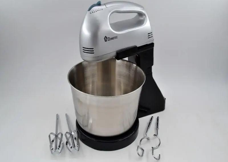 Міксер ручний з металевою чашею Domotec MS-1133 Міксер Domotec MS-1133 - прилад дуже зручний, легкий у використанні та очищенні, який допомагатиме готувати Ваші улюблені страви. Корпус міксера, підставка виготовлені із пластику, а насадки та чаша із нержавіючої сталі, продумана до дрібниць ергономіка надає додаткового комфорту у використанні даного міксера. Особливості : - Міксер Domotec MS-1133 поєднує в собі властивості ручного та стаціонарного міксера. - Він обладнаний двигуном, потужність якого становить 350 Вт і дозволяє легко збивати яйця, соуси, бісквітне тісто і т.д. - Ручний міксер із чашею MS-1133 має 7 швидкісних режимів роботи для збивання продуктів різної густини. - У комплекті Domotec MS-1133 є велика чаша, на яку легко встановлюється міксер, тим самим перетворюючи його на стаціонарний прилад, що дозволяє звільнити руки на кухні. - Також є два віночки для збивання і додаткові гаки для замішування тіста, що оцінять господині, які люблять радувати свою сім'ю різною випічкою. Характеристики: - 7 швидкостей - Харчування: 220V 50Hz - Потужність: 350W - Матеріал корпусу: пластик, метал - Металева чаша - Об'єм чаші: 2л - Нахил підставки на 45 градусів - Кнопка для зручної екстракції насадок - Колір: сріблястий, підставка чорна - Довжина кабелю живлення: 90 см - Розмір міксера: 17,5 x 7 x 12 см Комплектація: - Міксер - Насадка для збивання 2 шт. - Насадка для тесту 2 шт. - Підставка - Чаша - Упаковка