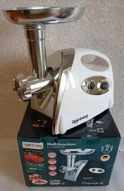 Описание Электрическая мясорубка Rainberg предназначена для изготовления фарша из мяса, рыбы, грибов, нарезки овощей и фруктов, профилирования песочного и пельменного теста. Тип мясорубки – шнековый. Эта модель снабжена функцией “реверс”: для предотвращения уплотнения продуктов внутри мясорубки предусмотрен режим обратного вращения шнека. Корпус мясорубки изготовлен из прочного пластика, на нижней части корпуса расположены прорезиненные ножки для дополнительной стойкости. Мощность двигателя 3800 Вт, 2 острых ножа из нержавеющей стали. Головка корпуса из алюминия. Набор решеток для приготовления фарша. Низкий уровень шума. Крестообразный нож из нержавеющей стали. Мясорубка – незаменимый прибор в домашнем обиходе. Прекрасное приспособление, которое сэкономит максимум времени во время приготовления фарша и колбас. Мощность мясорубки составляет 3800 Вт, то есть, за 1 минуту его эксплуатации вы сможете приготовить до 2 кг фарша. Характеристики: Мощность 3800 Вт; Система реверса; Защита двигателя от перезагрузки; Прочный металлический шнек; Соковыжималка; Шнек для соковыжималки; Резиновые ножки для дополнительной стойкости; 3 насадки с отверстием разного диаметра (3mm. 5mm. 7mm); 2 ножа из нержавеющей стали; Металлический лоток для продуктов. Комплектация: Мясорубка Rainberg 3 насадки с отверстием разного диаметра 2 ножа из нержавеющей стали Насадка для сока Насадка “кубе” для приготовления домашней колбасы
