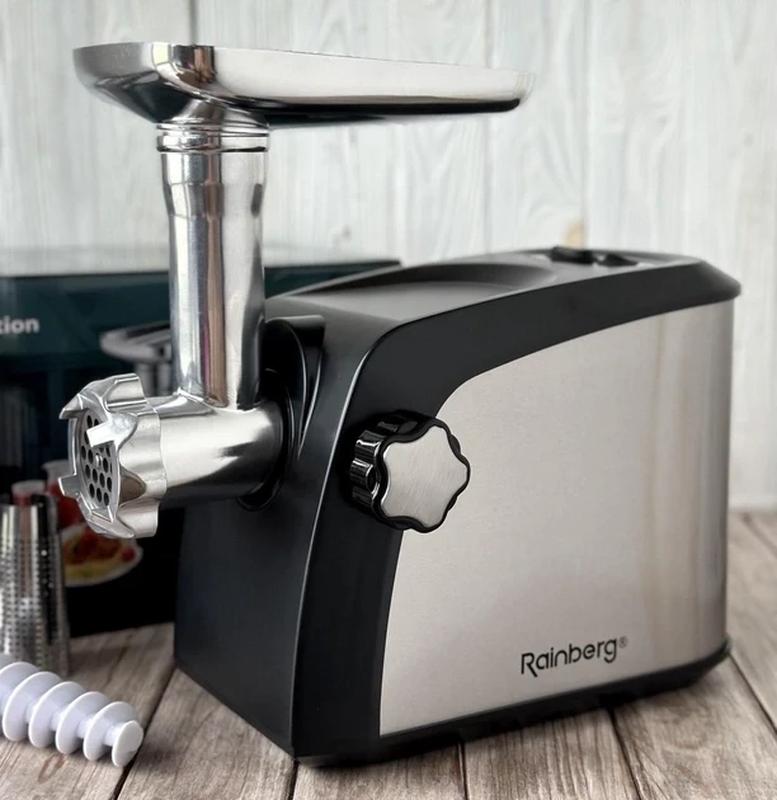Мясорубка электрическая профессиональная Rainberg RB-673A 3800W, электромясорубка с соковыжималкой Мясорубка Rainberg RB-673A 3800 Вт – это ваш надежный напарник и помощник на кухне. Качественная и доступная по своей стоимости модель электрической мясорубки от фирмы Rainberg предназначена для приготовления домашнего фарша из мяса различных видов, овощей, рыбы, а также грибов, тертиков и ветчины. Модель комплектуется набором полезных аксессуаров: сменные металлические сеточки для фарша разного диаметра: 3, 5, 7 мм, позволят готовить вкусный и сочный домашний фарш различной консистенции. Стильный корпус с элементами из нержавеющего металла и прочного пластика придают внешний вид современности и элегантности. Мясорубка Rainberg оснащается функцией обратного хода шнека. Это позволит извлекать уплотненные мясные остатки в шнековой камере, а также извлечь намотанные жилы, хрящи и мелкие косточки. Товар поставляется в заводской картонной коробке. Особенности: Корпус из нержавеющей стали и ударопрочного пластика; Низкий уровень шума, реверсия; Защита двигателя от перегрева; Прочный металлический шнек; металлический лоток для продуктов; Резиновые ножки для дополнительной устойчивости. Характеристики: Тип мясорубки: шнековый; Мощность:3800 Вт; Производительность мясорубки:1 кг/мин; Количество решеток: 3; Реверс: да; Материал насадок:нержавеющая сталь; Защита двигателя от перегрузки: да; Нож:нержавеющая сталь; Шнек:нержавеющая сталь; Лоток:нержавеющая сталь. Комплектация: Мясорубка электрическая Rainberg RB-673A; 2 ножа из нержавеющей стали; 3 насадки с отверстием разного диаметра (3мм, 5мм, 7мм); Насадка "Кеббе" для приготовления домашней колбасы; Насадка для профилирования теста; Насадка для соку; Пластиковый толкатель; Шнек; Лоток; Инструкция Заводская упаковка.