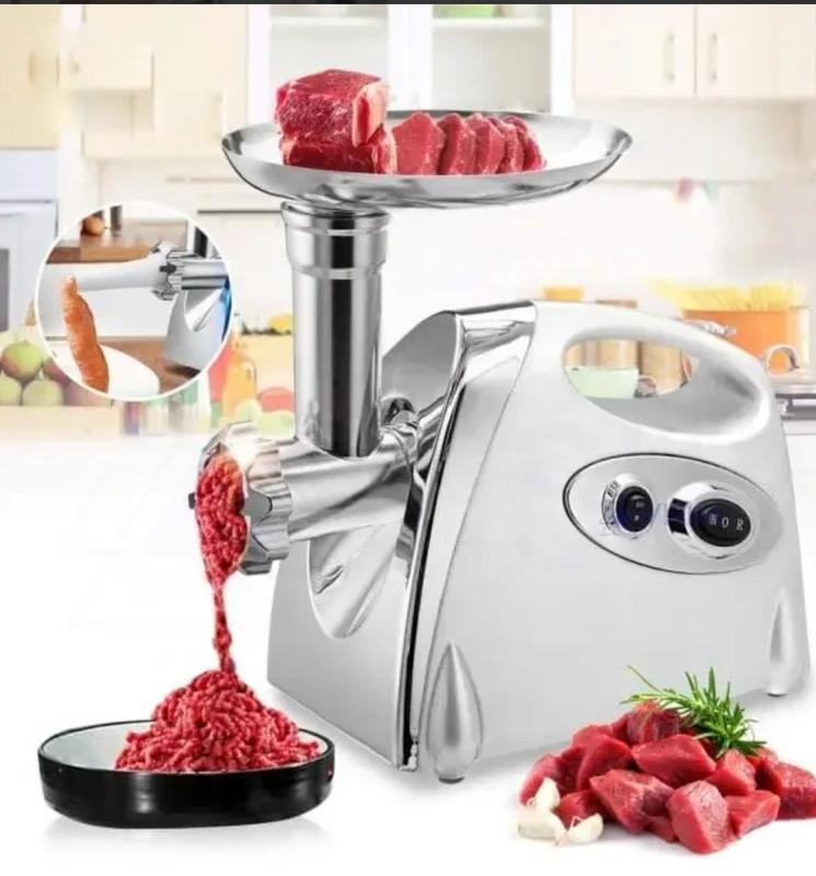 Электрическая мясорубка Rainberg предназначена для изготовления фарша из мяса, рыбы, грибов, нарезки овощей и фруктов, профилирования песочного и пельмененного теста. Тип мясорубки – шнековый. Данная модель снабжена функцией "реверс": для предотвращения уплотнения продуктов внутри мясорубки предусмотрен режим обратного вращения шнека. Корпус мясорубки изготовлен из прочного пластика, на нижней части корпуса расположены резиновые ножки для дополнительной устойчивости. Мощность двигателя 3800 Вт, 2 острых ножа из нержавеющей стали. Головка корпуса из алюминия. Набор решеток для приготовления фарша. Низкий уровень шума. Крестообразный нож из нержавеющей стали. Мясорубка - незаменимый прибор в домашнем обиходе. Отличное приспособление, которое сэкономит максимум времени при приготовлении фарша и колбас. Мощность мясорубки составляет 3800 Вт, то есть, за 1 минуту ее эксплуатации вы сможете приготовить до 2 кг фарша. Характеристики: Мощность 3800 Вт; Система реверса; Защита двигателя от перегрузки; Прочный металлический шнек; Соковижималка; Шнек для соковижималки; Резиновые ножки для дополнительной устойчивости; 3 насадки с отверстием разного диаметра (3mm. 5mm. 7mm); 2 ножа из нержавеющей стали; Металлический лоток для продуктов. Комплектация: Мясорубка Rainberg 3 насадки с отверстием разного диаметра 2 ножа из нержавеющей стали Насадка для соку Насадка "кубе" для приготовления домашней колбасы