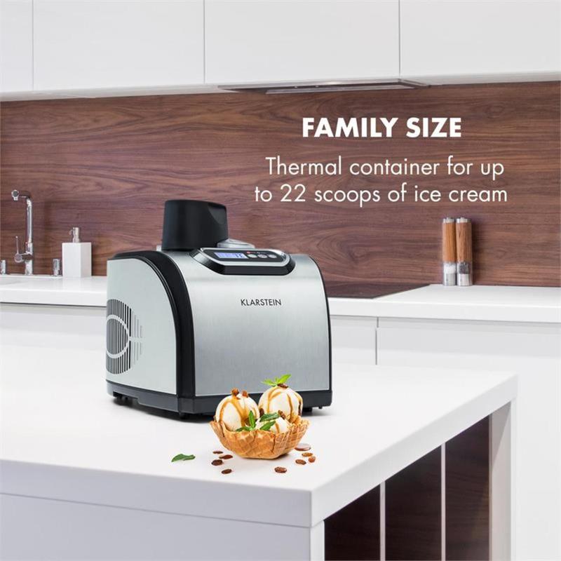 Основні характеристики: - Універсальність: проста морожениця для холодних страв, як-от морозиво, м'яке морозиво або заморожений йогурт - Без попереднього охолодження: свіже морозиво за 10-60 хвилин без попереднього охолодження контейнера або інгредієнтів. - Для всієї родини: термоконтейнер для морозива об'ємом до 1,5 л Економність: споживана потужність усього 150 Вт - Просте керування: лише дві кнопки для встановлення часу приготування готово Характеристики: - Функція подальшого охолодження запобігає таїнню морозива після приготування. - Регульований таймер із кроком 10 хвилин: 10-60 хвилин - Відтворення робочого часу, що залишився під час роботи - Замок безпеки в кришці - Матеріал контейнера: алюміній (безпечний для смаку) - нековзні гумові ніжки для надійної підставки - легке очищення завдяки знімним частинам - Перемикач вмик./вимк. на панелі керування - містить у собі відерце для льоду та мірний стаканчик - Отвір у кришці для зручного додавання інгредієнтів - Електроживлення: 220-240 В~ ⁇ 50/60 Гц Обсяг постачання: - 1 х пристрій - 1 х кришка з приводом - 1 х паличка для перемішування - 1* совок для льоду - 1* мірний стакан - Керівництво користувача німецькою мовою (інші мови: англійська, іспанська) Габаритні розміри: - Розміри (пристрій): 29 х 32 х 37 см (ШхВхГ) - Розміри (термоконтейнер): 18 x 12 см (ВxØ) - Вага (пристрій): приблизно 10 кг