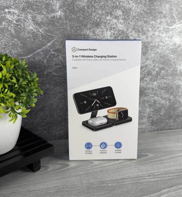 Зручна зарядна станція 3 в 1 — одночасно заряджає телефон, годинник і навушники. Працює стабільно, заряджає швидко й без перегріву. Виготовлена з якісних матеріалів, має стильний чорний дизайн. Підходить для будь-яких пристроїв з MagSafe У комплекті: станція та кабель Type-C.