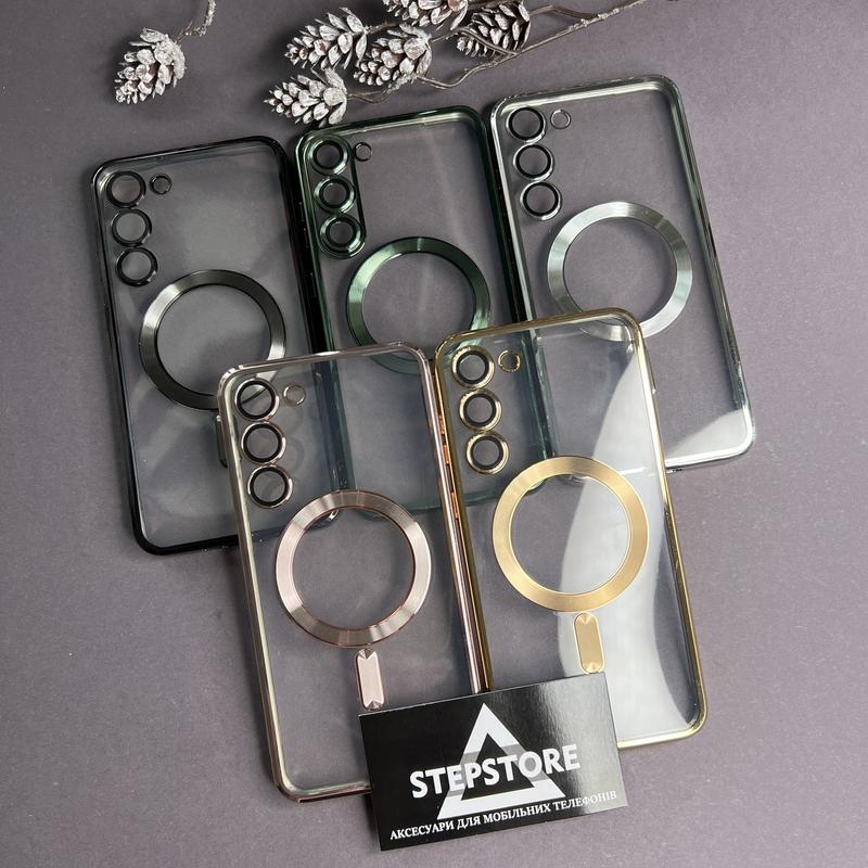 Чохол із лінзами на камеру для samsung s23 plus magsafe прозорий хромований обідок протиуд...