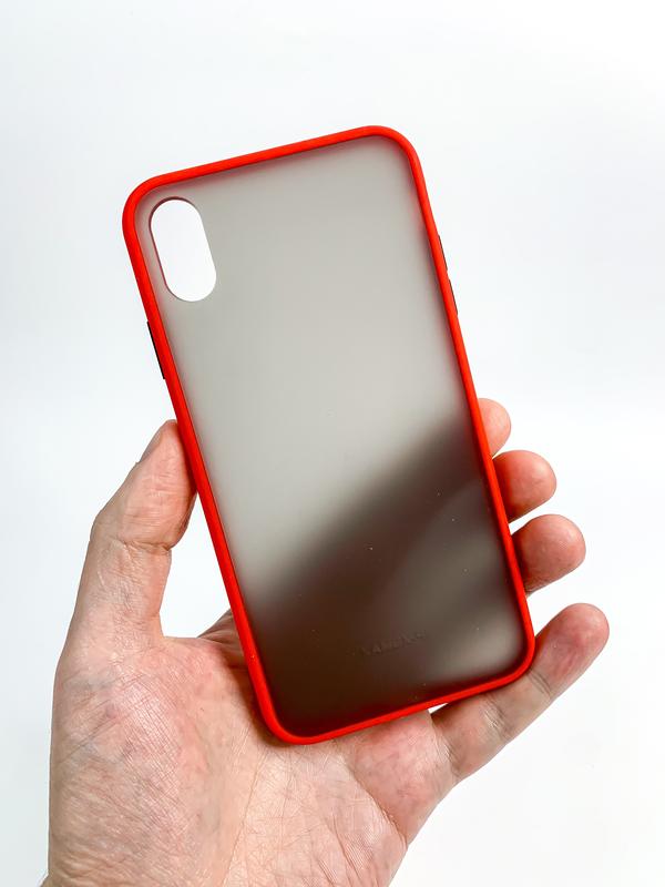 Протиударний чохол для iPhone Xs Max. Бампер виготовлений з поліуретану, тильна сторона виготовлена з темного матового пластику Колір: червоно -чорний Розпродаж залишків чохлів. Чохли всі нові Всі представлені фото живі, зроблені нами