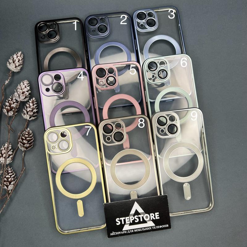 Чохол для iphone 15 з magsafe лінзами на камеру прозорий матовий обідок протиударний хромо...