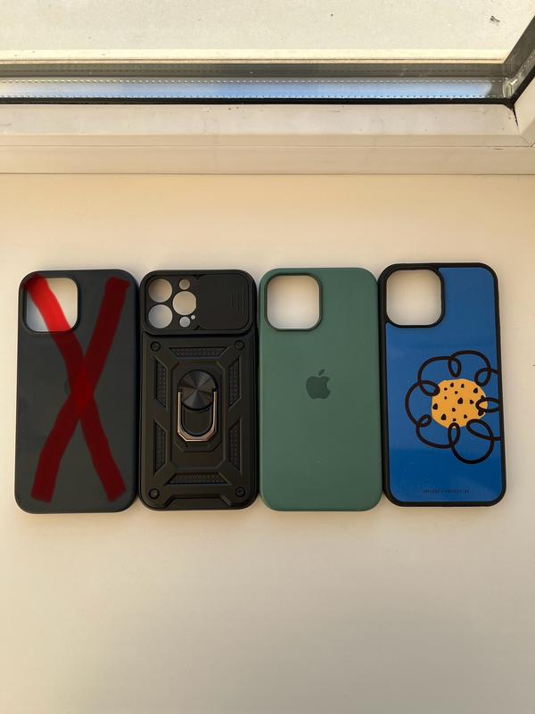 В наявності три чохла для айфона 13 про макс (один матовий (зелений), один пластиковий, та один протиударний) Зелений матовий має невеличкий дефект (див. останнє фото) Ціна вказана за один протиударний чохол Ціна чорного матового та пластикового - 120 грн Ціна - матового з дефектом - 99грн