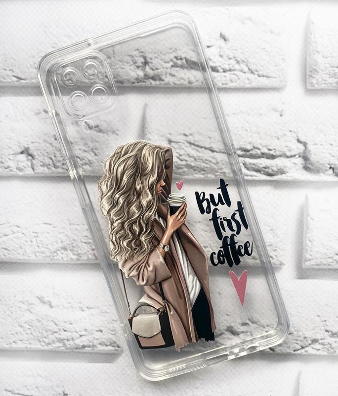 Прозорий чохол на samsung a12 4g дівчина з кавою принт 114