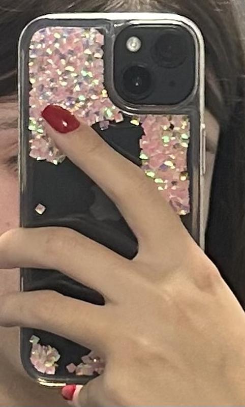 Прозорий силіконовий чохол з рожевими голографічними блискітками у формі маленьких квадратиків. Блискітки вільно рухаються всередині, створюючи ефект “снігової кулі” та яскраво переливаються на світлі. Чохол захищає телефон від подряпин і легких ударів, зберігаючи доступ до всіх кнопок та роз’ємів. Чохол трішки пожовтів