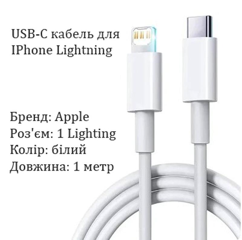 Кабель USB-C to Lightning для iPhone (1m) Бренд: Apple Роз'єм: 1 Lighting Колір: білий Довжина: 1 метр Гарантія: 1 міс.