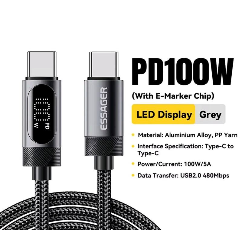 Надійний зарядний кабель для телефону essager 100w(вт)/ 5A довжиною 1 метр pd В наявності багатий вибір кабелів та адаптерів для будь- якої техніки. Надійний та якісний кабель для зарядки телефону, планшета чи ноутбука фірми Essager. Кабель Type-C на Type-C (PD) пропускна потужність 100 Вт/5A із вбудованим тестером по потужності. Довжина 1 метри Колір чорний