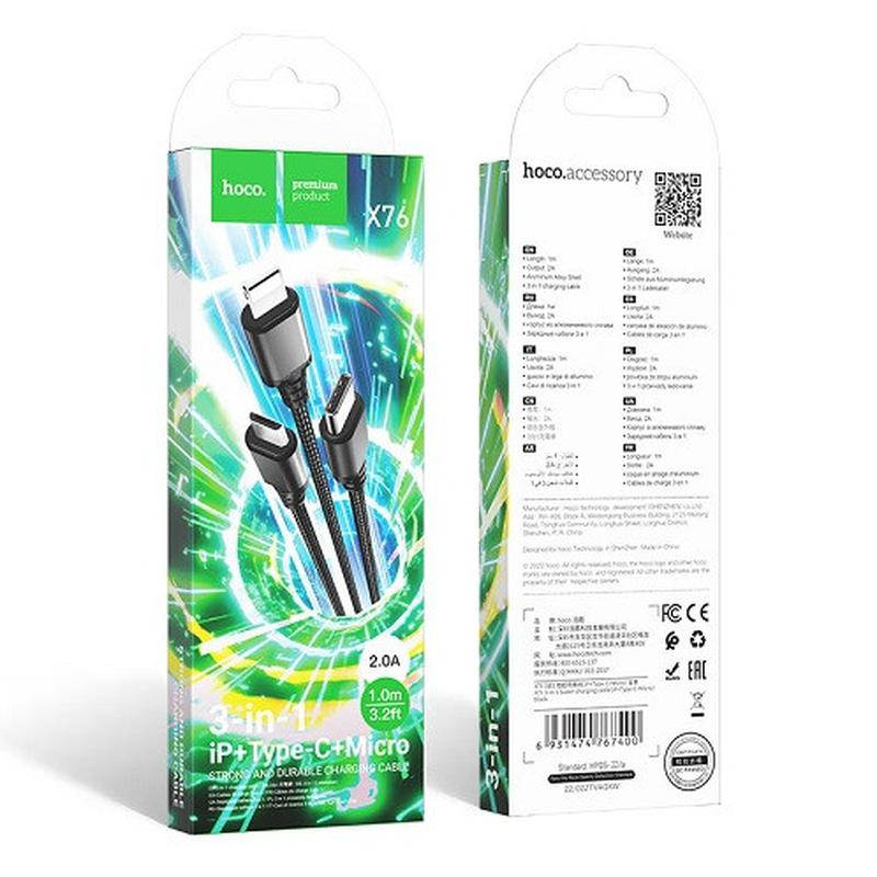 Кабель 3in1 USB - micro USB /Type-C /Lightning Hoco X76 Super charging cable Мінімальна загальна сума замовлення в кошику — 333,00 грн. * * * Наш графік роботи: Нб-ш09:00-17:00. Закази, оформлені після 16:00, будуть прийняті та оброблені наступного робочого дня!