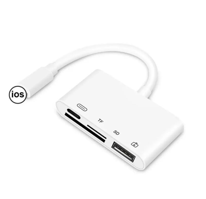 Перехідник Lightning, USB OTG конвертер SD/TF кардридер, адаптер для iPad iPhone Особливості aдaптepa lightning usb 4: 1. Багатофункційний адаптер Ви зможете під'єднувати різні периферійні пристрої USB: концентратори, Ethernet-адаптери, інтерфейси аудіо/MIDI та пристрої читання для карт CompactFlash, SD, microSD та інших форматів. 2. Не вимагає встановлення програми — з удосконаленим адаптером OTG стало набагато простіше переносити світлини або відео з камери на iphone або ipad. Простота у використанні, під'єднай і користуйся без встановлення сторонніх програм. 3. Сумісність — Адаптер usb-камери підтримує стандартні формати фотографій, як-от JPEG і RAW, а також формати SD і HD відео, включно з H.264 і MPEG-4. 4. Підтримка передавання u-диска, розумна сумісність (Примітка: читання u-диска, підтримка тільки систем s вище IOS13)
