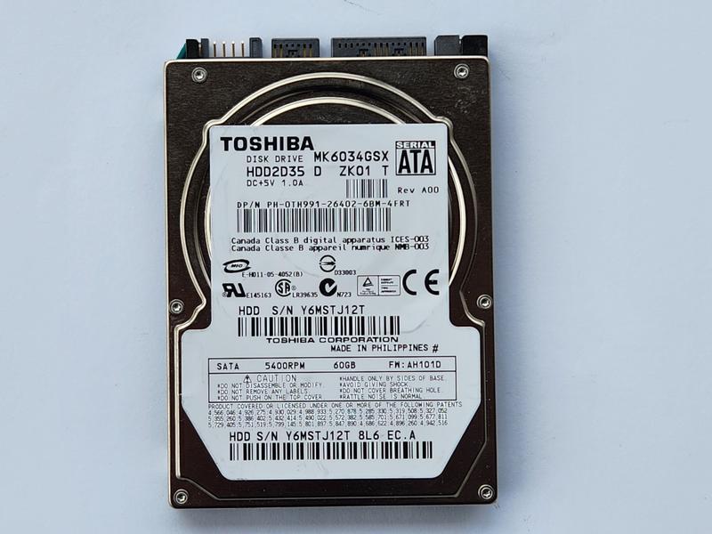 Виробник: Toshiba Тип накопичувача: HDD диски Продам HDD Toshiba SATA 60Gb MK6034GSX HDD2D35 в невідомому стані продаю як не робочій a906
