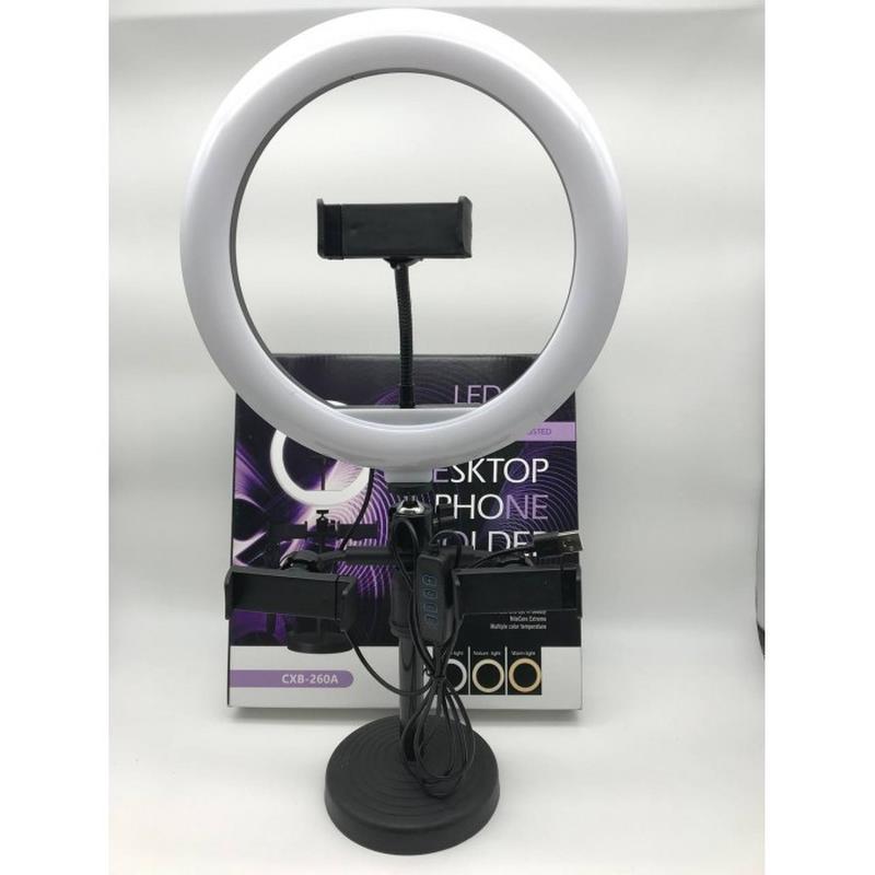 Кільцева лампа CXB-260A — це чудовий помічник у створенні світла для перукарів, візажистів, nail-майстрів, майстрів із нарощування вій, блогерів, тик-токерів, а також для всіх інших! Переваги: - Висока яскравість - Чудово підходить для фотознімання, як портретної, так і предметної - Можливість регулювання температури світла - Гнучке кріплення для телефона - Затискний регульований тримач для телефона звільнить ваші руки - Працює від USB - У комплекті підставка з тримачами Опис: Led-лампа CXB-260A ідеально підійде візажистам, hair-стилістам, стилістам- парикмахерам, тату-майстрам, майстрам перманентного макіяжу, фахівцям з оформлення брів, фотографам, блогерам. Лампу також використовують усі, хто цікавиться у добрих і якісних знімках: магазини, інтернет-магазини та шоу- руми. Живиться від порту USB ПК або ноутбука (або інших спідніх пристроїв, може працювати від мережі 220 (потрібно додатково блок живлення)), для освітлення «процесу» запису або передавання інформації. На дроті, що проводить струм, встановлений багатофункціональний вимикач із декількох варіантів керування. Характеристики: - Тип: кільцева лампа/світлодіодна лампа/лампа для блогера - Потужність: 20 Вт; - Колірна температура: 3200K-5600K; - Діаметр кільця: 26 см; - Кількість світлодіодів: 128 шт; - Матеріал: пластик; - Висота стійки: 34 см; - Кріплення для двох телефонів; - Колір світіння: холодний білий, теплий жовтий, змішаний; - Регулювання: є можливість регулювання температури світла та яскравості світіння; - Індекс передавання кольору: > 90 Ra; - Дальність освітлення до 10 метрів. - Матеріал затискача: вуглецева сталь; - Джерело живлення: USB 5V (Живлення від USB дасть можливість працювати від Power Bank, ноутбука, комп'ютера або кубика для заряджання телефонів і планшетів); - Кріплення на штатив/стійку (різьба 1/4 дюйма); - Шарнірне з'єднання дає можливість обертати головку тримача на 360°, а також змінювати кут нахилу, що дає змогу встановлювати світлове обладнання під будь-яким необхідним кутом. Комплектація - Кільця лампа CXB-260A; - Кріплення на штатив/стійку; - 2 шт Кріплення для телефона на стійці; - Кріплення для телефона на підсвітці; - Стійка; - Пульт (вбудований на шнурку).