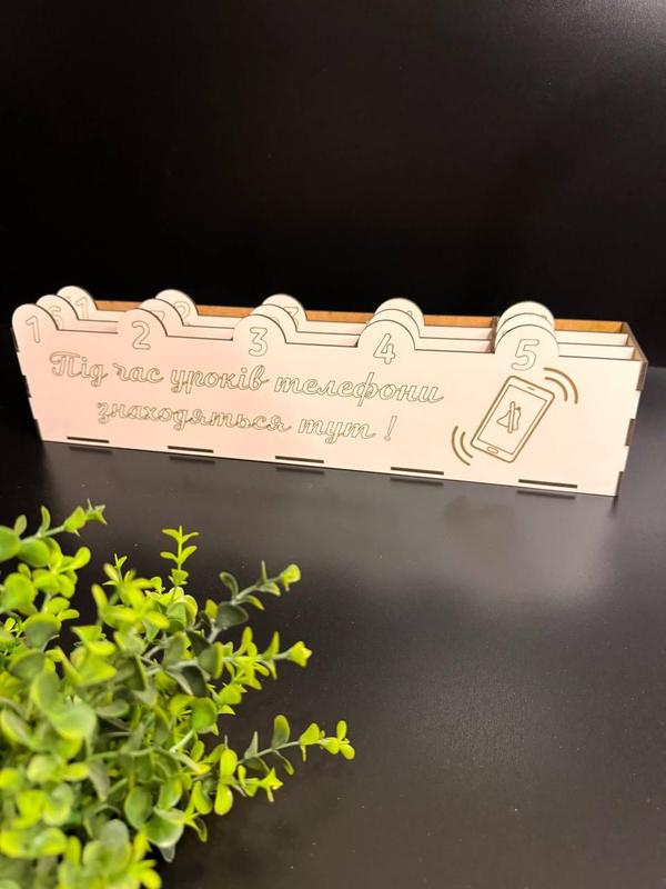 Дерев'яна підставка органайзер для зберігання телефонів смартфонів до школи на 15 осередків. Підставка органайзер для телефонів для використання в школі, навчальних закладах, щоб нічого не відволікало дітей від зайняти. Містить 15 відділень розміром довжина-47см. ширина-9см. висота-10см. Напис на передній кришці та нумерація входити до вартості.