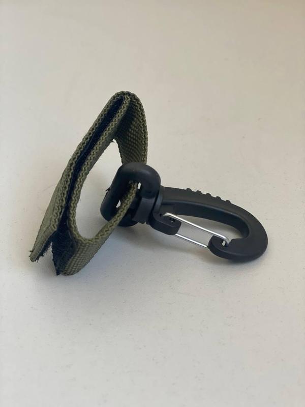Тримач-карабін призначений для кріплення рукавичок, турнікету або іншого тактичного спорядження. Кріпиться на пояс, рюкзак, бронежилет або іншу амуніцію, обладнану системою Molle. Він обладнаний фіксатором-липучкою, який забезпечує щільний обхват, який регулюється за потреби та запобігає випаданню амуніції під час виконання різких рухів. Спеціальний тримач-карабін забезпечує: - надійну фіксацію та простоту в застосуванні; - легкий і швидкий доступ до рукавичок або будь-якої іншої амуніції; Характеристика: Колір — олива Довжина — 20 см Ширина — 2,5 см Матеріал — подвійна стропа, липучка, пластиковий карабін