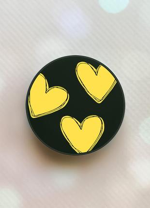 Тримач для смартфона / планшета попсокет popsocket чорний :: сердечка жовті (принт 259)