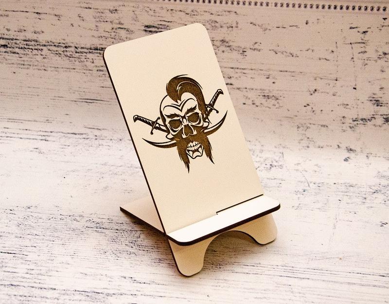 Оригинальная подставка под телефон Размер под телефон:13,3*8,4см общий размер 16,5*8,4см Материал - ламинированное ДВП. Гравировка от 50грн, в зависимости от сложности работы. Цвет: одна сторона белая, вторая крафт. Особенности: белую сторону можно протирать влажной тряпкой, после этого вытереть сухой. Мочить водой нельзя - это приведет к набуханию.
