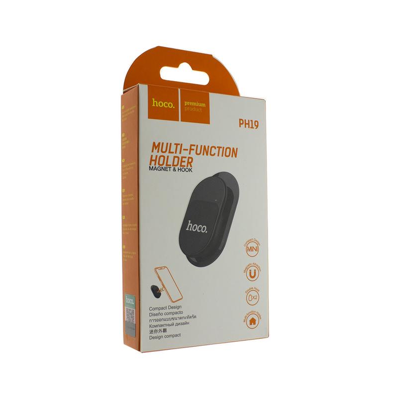 Автотримач Hoco PH19 — компактний і простий у використанні аксесуар. Неординарна конструкція цього пристрою виготовлена як магнітний тримач із гачком, який дає змогу зручно зафіксувати в салоні авто не тільки смартфон, а й кабель або іншу дрібницю. Модель має невеликі розміри та вагу, виготовлена з якісного матового пластику з текстурованою поверхнею з ефектом блика, оригінальний дизайн, також підкреслений глянсовими деталями. Магнітна фіксація телефона здійснюється за допомогою пластини, що фіксується на зворотному боці кришки корпусу або під чохлом. Закріпити аксесуар на торпедо автомобіля можна за допомогою клейкої основи. До комплекту входять металеві пластини та два додаткові гачки, виготовлених за тим самим типом, що й тримач, і можуть використовуватися вдома або в офісі, наприклад, для фіксації на них ключів, навушників, кабелів. Автотримач Hoco PH19 — зразок поєднання ціни та якості серед товарів цього класу.