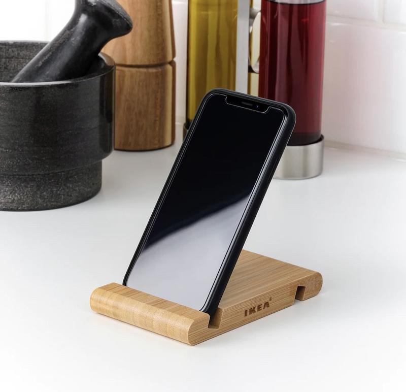Просте і практичне рішення, що стане у нагоді під час відеодзвінків, переписок чи просто пошуку інформації в Інтернеті. Виготовлено з легкого бамбуку, займає небагато місця та має 2 прорізи, що підходять для більшості пристроїв — навіть із чохлами. Ваші руки залишатимуться вільними під час розмови чи пошуку на мобільному телефоні. Має 2 прорізи різного розміру, тому підходить для більшості телефонів і планшетів. Виготовлено з бамбука — міцного натурального матеріалу, за яким легко доглядати. Підходить для мобільних телефонів / планшетів розміром макс. 11 дюймів. Дизайнер IKEA of Sweden Матеріали та догляд Бамбук, Прозорий акриловий лак Протирати вологою тканиною. Витирайте насухо чистою тканиною.