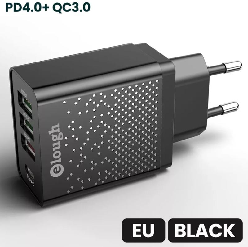 Сетевое зарядное устройство с быстрой зарядкой 4 port - мощный адаптер, который поддерживает новейшую технологию быстрого заряда PD, с поддержкой протоколов быстрой зарядки Quick Charge. Интеллектуальная микросхема определяет тип подключенного устройства, регулирует напряжение и силу тока, обеспечивая быструю зарядку и высокую совместимость с устройствами большинства современных брендов. Power Delivery - это технология быстрой зарядки, поддерживаемая последними моделями iOS и Android, которая обеспечивает гораздо более высокий уровень мощности, чем стандартная зарядка. Зарядка так же оснащена портом Quick Charge 3.0. На 40 % быстрее идет заряд. Зарядка оснащена специальным смарт-чипом, который автоматически определяет оптимальный ток, который может принять телефон или планшет. Данный гаджет Вам просто необходим в повседневной жизни на дома и в офисе. Зарядное устройство оснащено интеллектуальным чипом для защиты ваших устройств от короткого замыкания, перенапряжения, перегрева и перегрузки по току. Огнестойкий корпус ABS не будет перегреваться при зарядке, обеспечивая отличную производительность, независимо от царапин, ударов или падений. Защитите себя и свое оборудование изнутри. Особенности: Стильный дизайн. Зарядка оснащена портом: USB Power Delivery, Quick Charge 3.0, USB 2.4 А, USB Type-C. Компактный размер. Интеллектуальное распределение тока. Защита от перенапряжения. Зарядка совместима со всеми телефонами, планшетами и другими гаджетами. Универсальное зарядное устройство. Цвета в ассортименте. Огнезащитные материалы. Защита от короткого замыкания. Защита от перегрева. Качественная сборка. Приятная цена. Характеристики: Вид: Сетевое зарядное устройство. Бренд: eLough. Особенности: Smart Charge (интеллектуальное распределение тока). Количество ортов: 3 USB + PD. Выходной разъем: USB Type-C. Быстрая зарядка: USB Power Delivery, Quick Charge 3.0. USB 2.4 A. Ток: 100-240 V 48 W. Совместимость: iOS, Android, USB Type-C, USB. Материал: Пластик ABS + метал. Цвет: Черный. Комплектация: 1 х Зарядное устройство (без кабелей). 1 х упаковка. * Внешний вид товара может незначительно отличаться от фотографий на сайте в зависимости от партии.