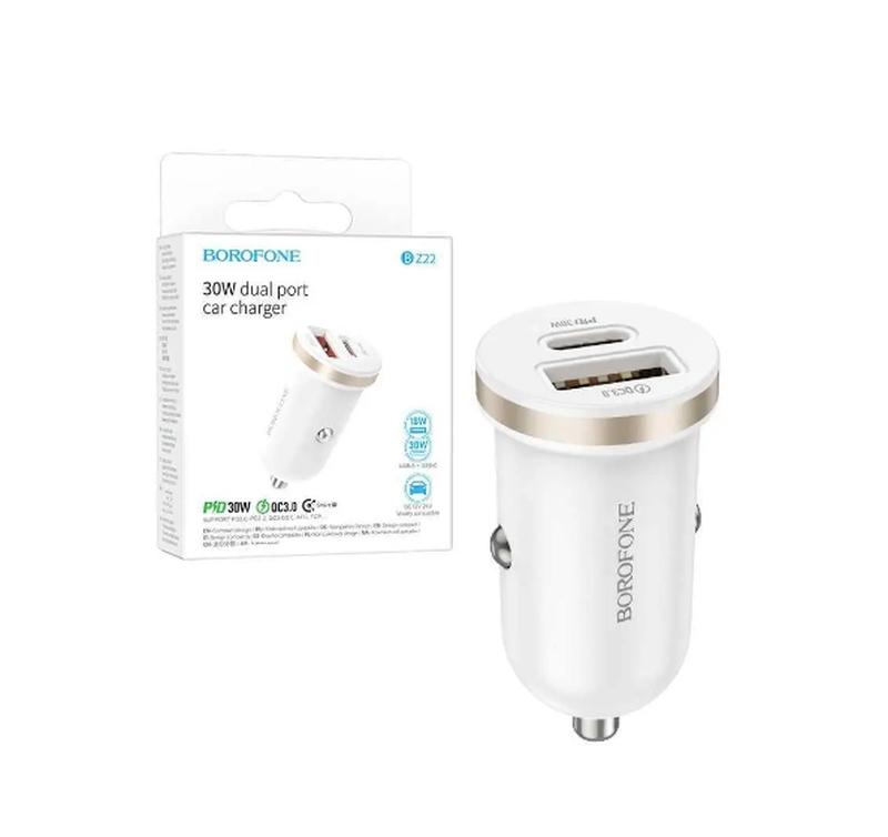 Зарядний пристрій 12В PD30W QC3.0 Type-Cx1 USBx1 Borofone BZ22 Зарядний пристрій - це автомобільний зарядний пристрій, який оснащений двома портами USB, для тих, хто хоче заряджати свої гаджети максимально швидко і ефективно в автомобілі. Зарядний пристрій має компактні розміри, і при цьому має продуману конструкцію, яка дозволяє одночасно підключати 2 пристрої для зарядки без будь-яких труднощів. Швидкий зарядний пристрій оснащений інтелектуальним чіпом для захисту ваших пристроїв від короткого замикання, перенапруги, перегріву та перевантаження струмом. Вогнестійкий корпус ABS не перегріватиметься під час заряджання, забезпечуючи відмінну продуктивність, незалежно від подряпин, ударів або падінь. Пружинні фіксатори на корпусі зарядного пристрою забезпечують надійну фіксацію всередині роз'єму прикурювача. Пристрій працює з підтримкою технології Qualcomm Quick Charge 3.0, яка автоматично ідентифікує тип підключеного пристрою, гнучко регулює напругу/силу струму і максимально швидко заряджає пристрій. Нова технологія дозволяє визначати та динамічно підлаштовувати оптимальну вихідну потужність безпосередньо під даний пристрій та етап процесу живлення. Характеристики Тип автомобільний зарядний пристрій Матеріал пластик Кількість USB-портів USB A — 1 шт. USB Type C — 1 шт. Живлення прикурювач 12-24 В USB A Output 5V-3A, 9V-2A, 12V-1.5A (QC 3.0 18W Max) USB Type-C Output 5V-3A, 9V-2A, 12V-2.5A 15V-2A, 20V-1.5A (PD 30W Max) Довжина пристрою 48 мм У ящику 392 шт. * * * Мінімальна загальна сума замовлення в кошику — 333грн. Наш графік роботи: сб-чт 09:00-17:00. Замовлення, оформлені після 16:30, будуть прийняті та оброблені на наступний робочий день! Товар вартістю до 15$ поверненню та обміну не підлягає!!!