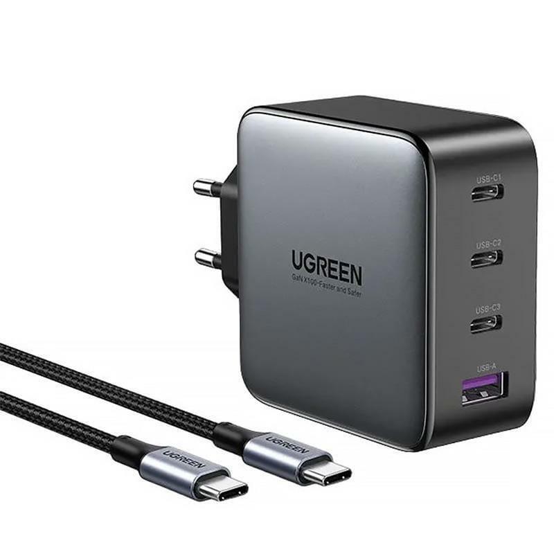 Зарядное устройство USB C/USB A на 100 Вт от Ugreen: - Заряджає ваші пристрої на високій швидкості - Включно з зарядним кабельом USB C завдовжки 150 см. - Маленький, тонкий і легкий, як пір'їнка, дизайн - Вихідна токова потужність до 100 Вт - Захист від короткого замикання, перенапруги та перегрівання - Підтримує функцію Power Delivery 3.0 - З трьома виходами USB C та одним виходом USB A - Генерує менше тепла завдяки технології GaN