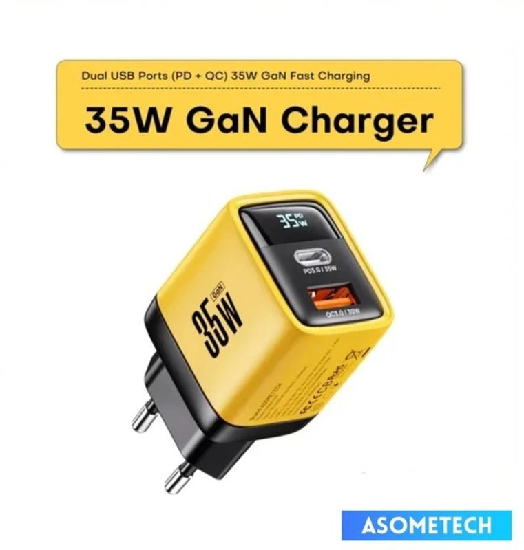 Зарядний пристрій ASOMETECH GaN модель CH009-H01 потужністю 35 Вт із нітриду галію має 2 виходи Type-C і USB A. Подвійний порт дає змогу одночасно заряджати смартфон і планшет. Швидко заряджає мобільні телефони, повербанки, планшети, ноутбуки та іншу ел.техніку. Технологія нового покоління GaN, це вдосконалена технологія, забезпечує менший розмір пристрою, стабільніший контроль температури та швидше заряджання. Це означає, що можна грати в потужні ігри на смартфоні у разі швидкого заряджання, водночас зарядний пристрій матиме низьку температуру. Інтелектуальний цифровий дисплей зображає потужність у реальному часі. ASOMETECH GaN модель CH009-H01 легко брати із собою в поїздці завдяки його маленьким розмірам. Також добре поміщається в розетці поруч з іншими штекерами та зарядками. Зарядний пристрій для ASOMETECH потужністю 35 W з PD3.0 QC3.0 PPS AFC FCP SCP SSCP. Порт Type-C підтримує швидке заряджання PD потужністю до 35 Вт і швидке заряджання 33 Вт PPS, порт USB A підтримує швидке заряджання QC3.0 потужністю до 30 Вт. Протокол швидкого заряджання сумісний з iPhone 14/Plus/Pro Max, MacBook Air, iPad Pro/Air/Mini, iPhone 13/13 Pro/13 Pro Max/13 Mini/12 Pro/12 Pro Мах, і пристрої Samsung Galaxу, Huawei, Xiaomi та інші. Функції Матеріал: PC + ABS Функція: швидке заряджання PD3.0+QC3.0 Потужність: 35W Колір: жовтий Розміри: 80 х 39 х 30 мм Вхід: AC100-240V~50/60Hz 1,5A (МАКС.) USB-C Вихід: 5V3A 9V3A 12V2.91A 15V2.33A 20V1.75А (макс. 35 Вт) PPS: 3,3-11 В = 3 А (максимум 33 Вт). USB-A Вихід: 5V3A 9V3A 12V3A 20V1.5A(30W макс.) Вихід Type-C+USB A: 5V 3.4А, 17W (макс.)