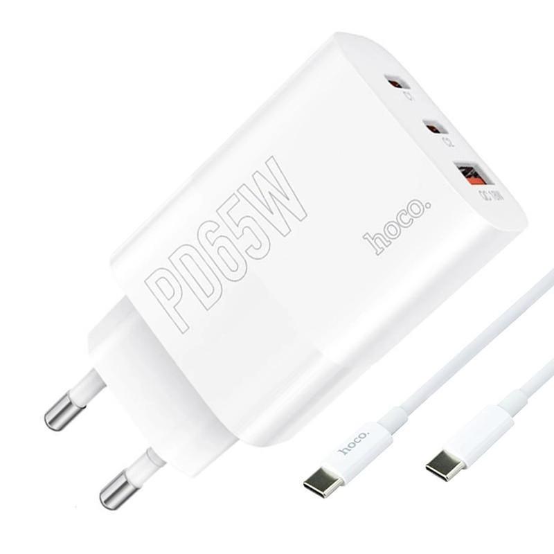 Зарядное устройство hoco usb + 2хtype-c pd/oc 65w + кабель type-c - type-c dc40 white