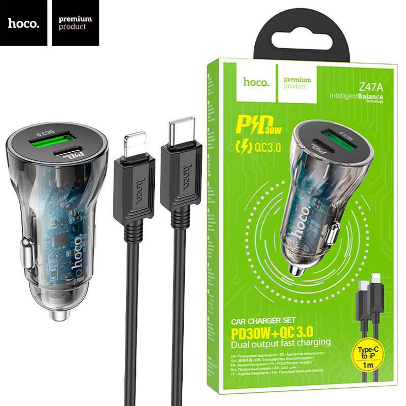 Автомобильное зарядное устройство hoco z47a pd30w + qc3.0 1usb type-c to lightning black