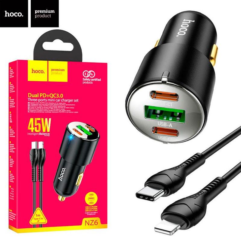 Автомобильное зарядное устройство Hoco NZ6 PD45W + QC3.0 2Type-C 1USB 3A Type-C to Lightning black