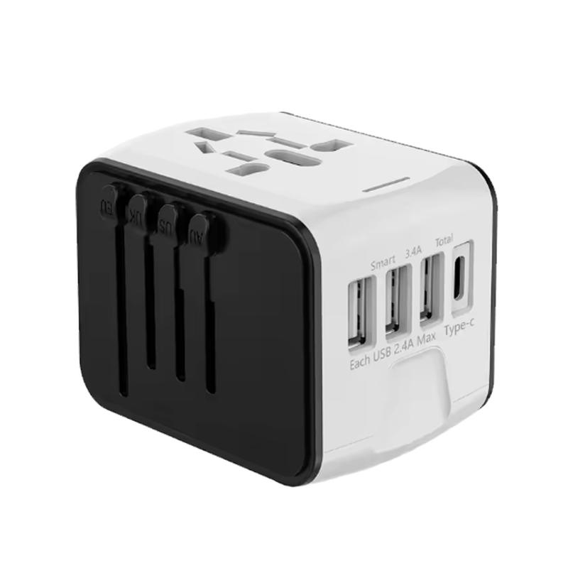 Універсальний адаптер для мандрівників. Це багатофункціональний адаптер, який підійде до більшості розеток світу. Щоб обрати потрібну вилку - натиснути на кнопку збоку адаптера. Підключити можна до будь-якого гаджету що має USB-кабель або слугує як перехідник з одного типу розетки на інший. Цей адаптер може працювати з пристроями високої потужності, такими як фен до 2000 Вт. Можна використовувати пристрої із подвійним вольтажом. Не конвертує вольтаж(АС-СА). Перед використанням переконайтеся, що розетка яку Ви збираєтесь використовувати має відповідну напругу. У комплекті додатковий запобіжник. Наявність 4-х USB-портів дає можливість заряджати кілька пристроїв. Тип підключення USA, UK, EU, AUS Матеріал: PC (Fire Retardant) / ABC Розміри: 64x50x50 мм Чотири виходи USB: 5V 2.4A, 12Вт Виход Type C 5V 3A, 15ВТ Номінальна потужність змінного струму 8 А макс. 100-250В змінного струму (880Вт макс при 110 В, 2000ВТ макс при 250 В) 50 / 60Hz Вага: 135 грам