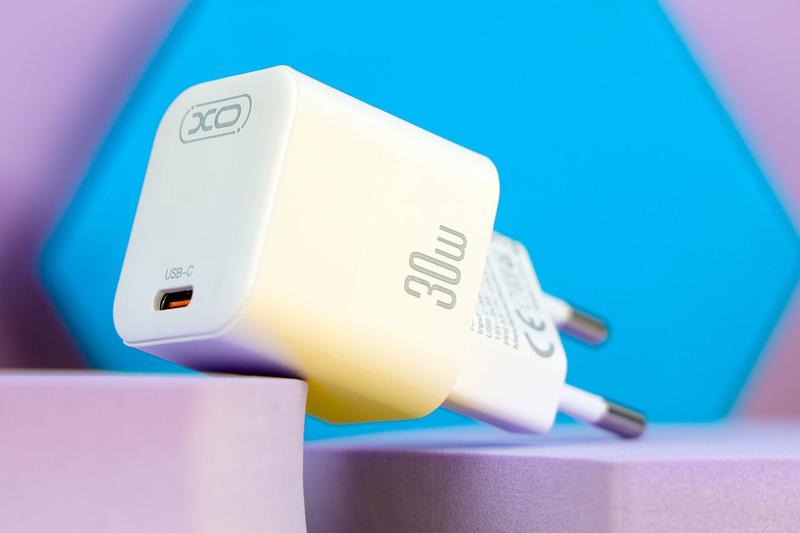Мережевий зарядний пристрій XO CE06 PD 30W GaN -- це невеликий, але неймовірно потужний адаптер, призначений для швидкого й безпечного заряджання портативних девайсів. На відміну від звичайних зарядних пристроїв, напівпровідники цієї моделі виготовлені не з кремнію, а з нітриду галію відповідно до сучасної технології GaN. Тому вона лаконічно поєднує в собі надзвичайно компактні розміри та потужну потужність, виділяється підвищеною безпекою й енергоефективністю, не перегрівається навіть за максимального навантаження. Корпус аксесуара виготовлений із міцного, стійкого до підвищених температур пластику, має приємну на дотик поверхню, виготовлений у практичній формі. На одному з його округлених ребер міститься LED-індикатор, за діагоналі його нижнього торцю розміщена мережева вилка стандарту EU, а на верхній панелі -- роз'єм Type-C. Модель підтримує швидке заряджання ґаджетів, сумісних із технологіями: QC2.0/3.0/4.0+, APPLE2.4A, Samsung AFS, Samsung-5V-2A, Huawei FCP, DCP1.5, PD3.0, PPS і PD36W. Максимальна вихідна потужність становить 30 Вт, напруга та сила струму: 5V/3A, 9V2.5A, 15V/2, 20V5A. Адапується комплектом Tpe-TC.