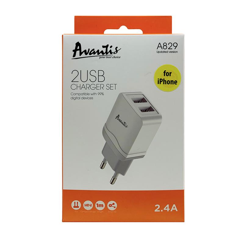 Мережевий зарядний пристрій avantis a829 (2 usb/2.4a) + usb-кабель lightning-білий