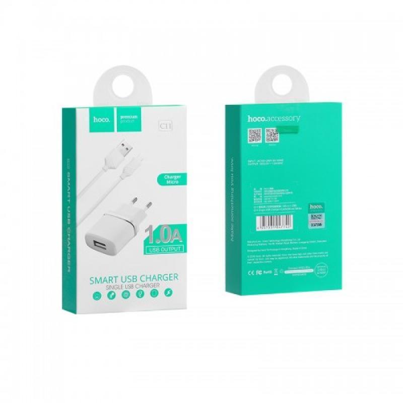 Мережевий зарядний пристрій Hoco C11 Smart USB. Порти - Micro USB - USB. Сила струму - 1А. Кабель Micro USB в комплекті. Упаковка - коробка.