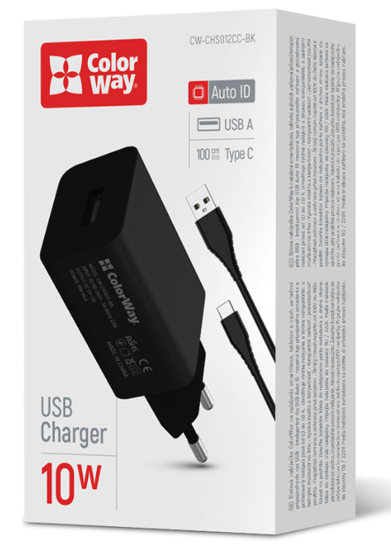 Сетевое зарядное устройство Colorway 1USB AUTO ID 2A (10W) черное + cable Type C-Идеальный набор для зарядки смартфонов, планшетов и различных USB устройств. Устройство на выходе имеет суммарную силу тока 2 А, а кабель в комплекте позволяет зарядить свой смартфон / планшет быстро и без негативного воздействия на батарею. Усиленные коннекторы – на порядок прочнее и выдерживают до 5 раз больше подключений, чем аналоги, а специальный протектор продлит жизнь кабеля, и предотвратит характерные повреждения. Длина составляет 1 метр, чего вполне достаточно для комфортного использования. Интеллектуальная микросхема USB Auto ID сама определит тип подключенного устройства и необходимый ток заряда от 0.1 до 2.0A, что обеспечивает быструю зарядку и высокую совместимость с устройствами большинства брендов. Имя: Сетевое зарядное устройство ColorWay 1USB AUTO ID 2A (10W) черное + cable Type C (CW-CHS012CC-BK) Артикул: CW-CHS012CC-BK Производитель: ColorWay Тип: Сетевые Максимальная сила тока: 2.0A Количество USB портов: 1 Цвет: Габарити: 87x36x28mm Входи: AC 100-240V 50-60Hz 0.5A Max Выходы: DC 5V⎓2.0A, 10W Max